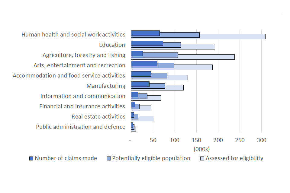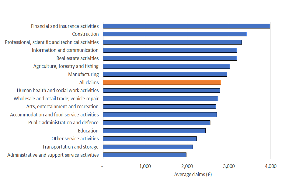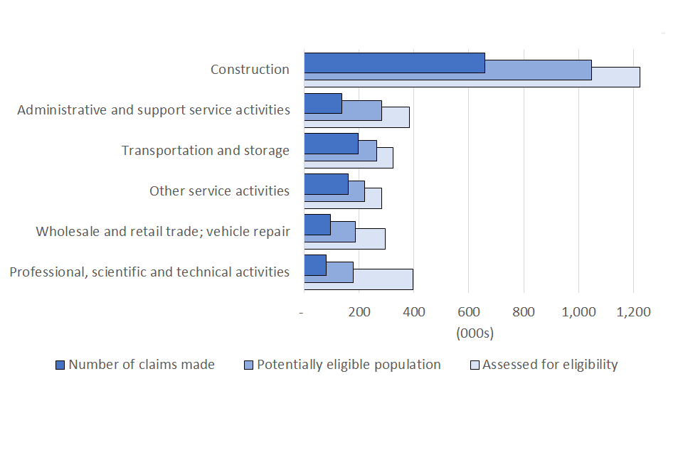 Self-employed individuals in the transportation and storage sector make up 8% of the potentially eligible population and made 197,000 claims totalling £422 million. Administrative and support services also make up 8% of the potentially eligible population and have made 137,000 claims totalling £271 million.