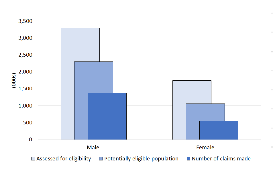 | Gender | Assessed for potential eligibility | Total potentially eligible population | Total no. of claims made | Total value of claims made | Average value of claims |