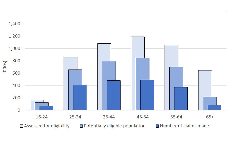 Around 89% of individuals who were assessed for potential eligibility were between the ages of 25 and 64, with over 91% of claimants coming from this age group. Take-up of the grant in these age-groups is at or above 58%, with the exception that those between 55 to 64 have a take up rate of 53%. No one age group dominates and claims are evenly spread.