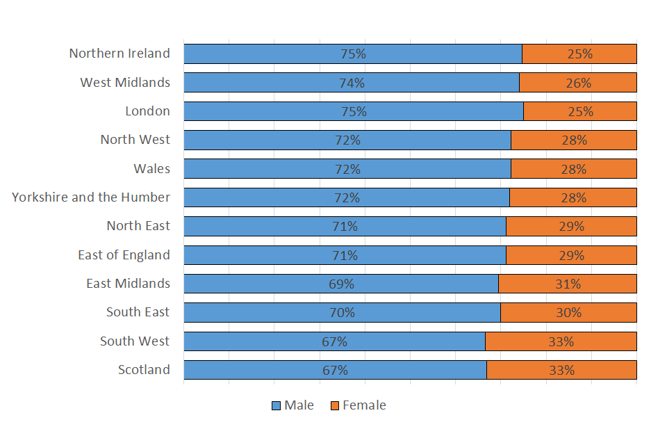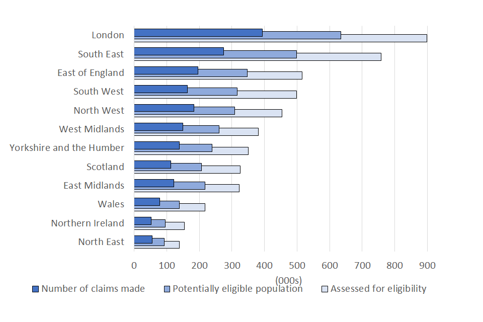 The area with the highest proportion of males in the potentially eligible population is Northern Ireland (73%) and the lowest areas are Scotland and the South West (65% each). A similar pattern is seen in the number of claims received by 31 December 2020 with male claimants accounting for 75% of claims in Northern Ireland and 67% of claims in Scotland.