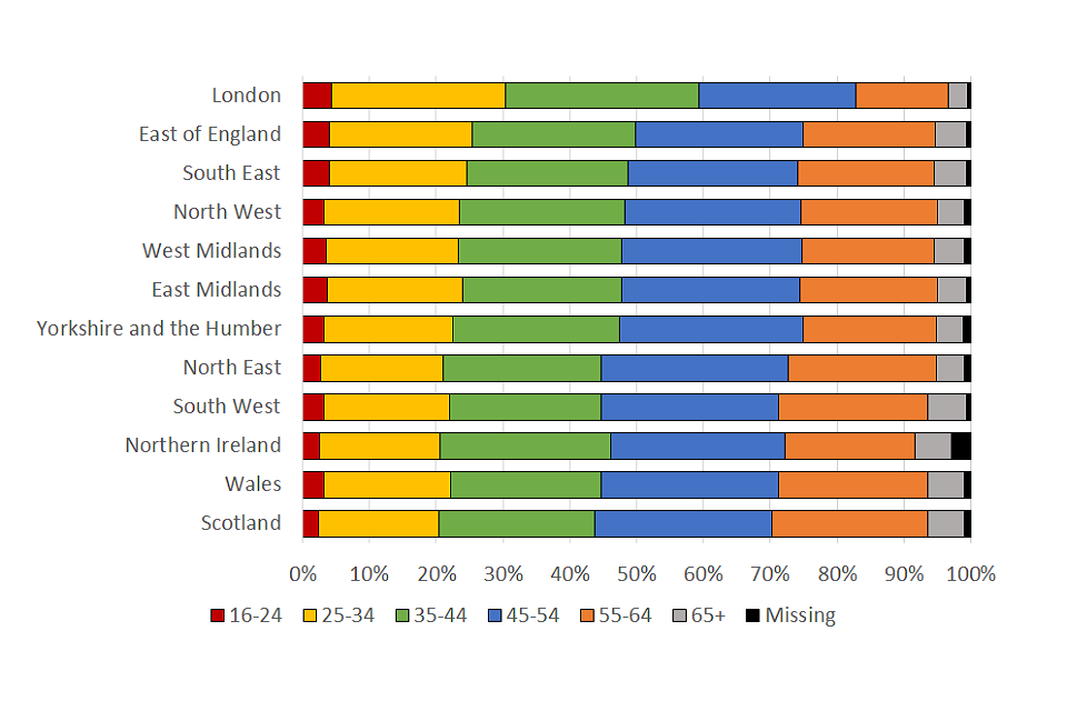 Between 41% (Wales, Scotland and Northern Ireland) and 46% (England) of the potentially eligible population in each country and region is aged under 45 except in London where 58% are under 45 and East of England where 47% are under 45.