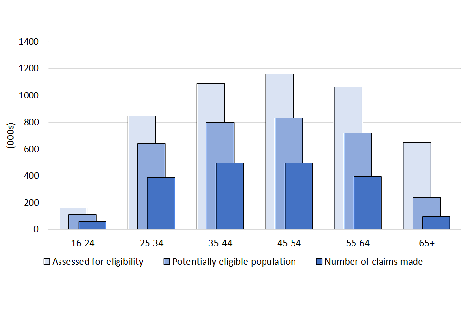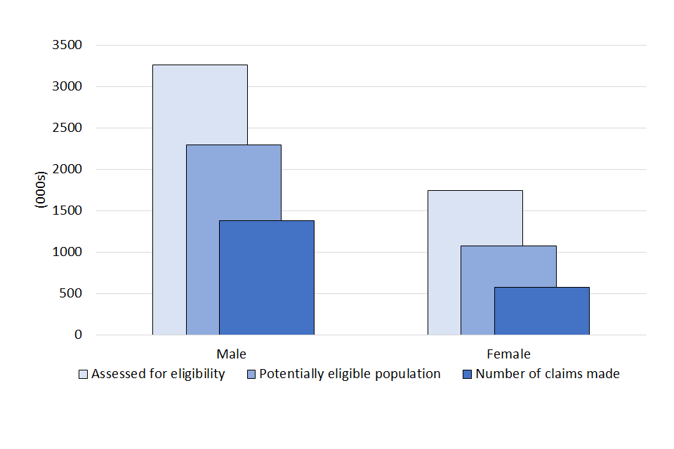 | Gender | Assessed for potential eligibility (000s) | Total potentially eligible population (000s) | Total no. of claims made (000s) | Total value of claims made (£m) | Average value of claims (£) |