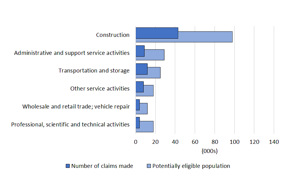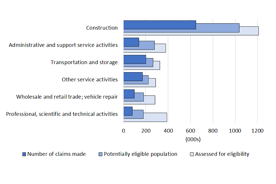 The sector with the highest number of potentially eligible individuals and the highest proportion of claims is the construction industry. By 6 June, construction workers had made 647,000 claims for the fourth Self-Employment Income Support Scheme grant, totalling £2.2 billion. Construction is the largest sector among the self-employed population with 1.2 million individuals assessed for eligibility