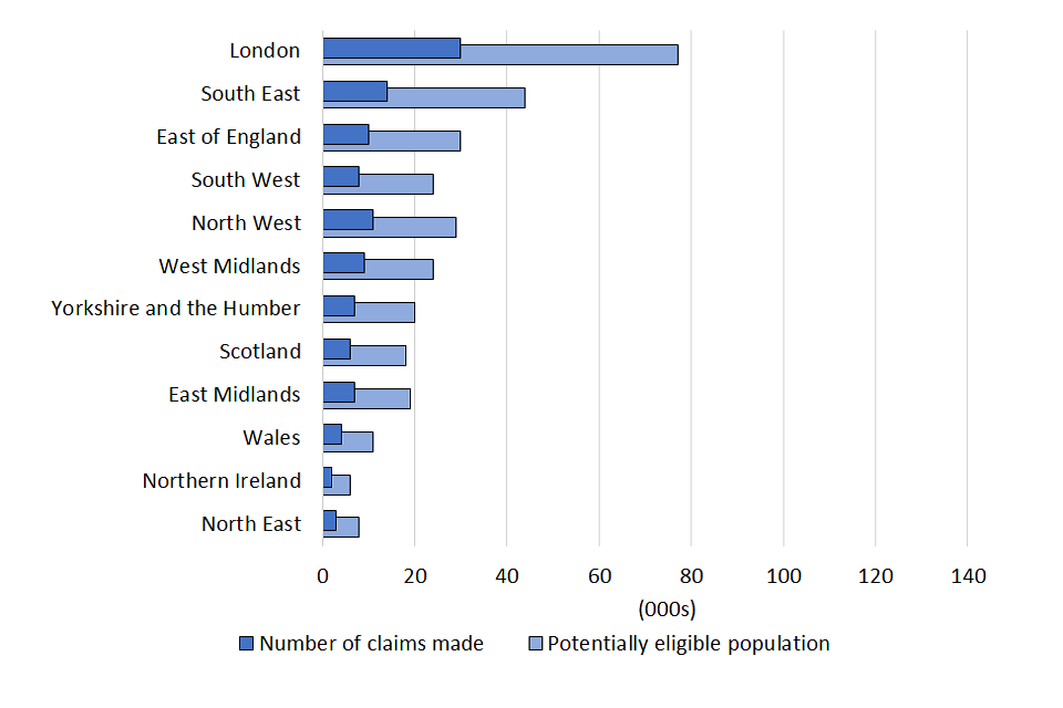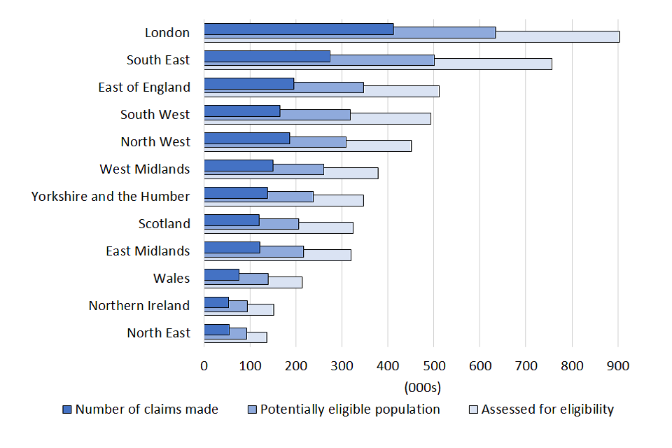 | Status | Total potentially eligible population (000s) | Total no. of claims made (000s) | Total value of claims made (£m) | Average value of claims (£) |