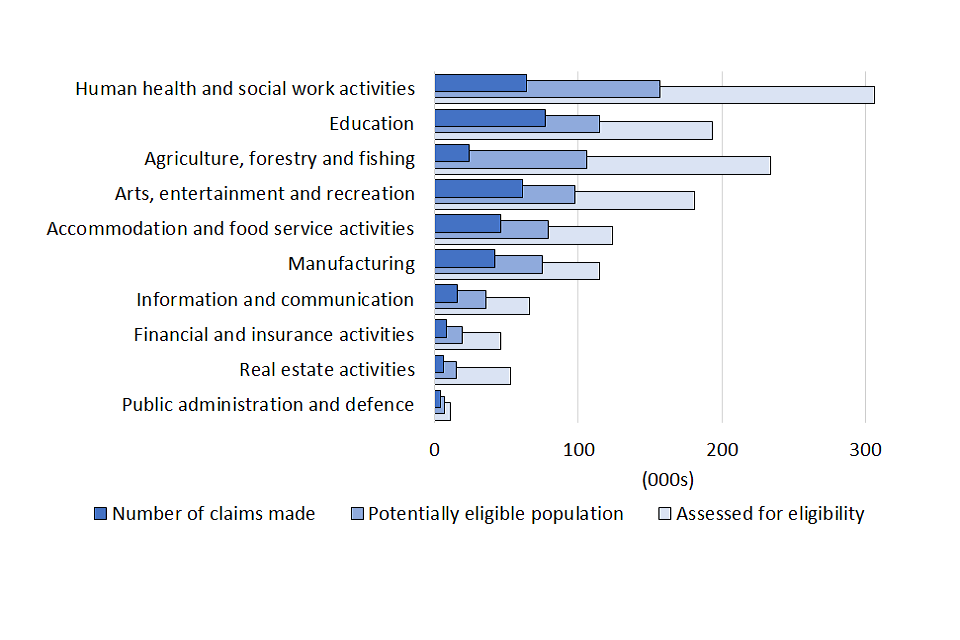 Via this process, 3.4 million self-employed individuals were identified as potentially eligible for the fourth Self-Employment Income Support Scheme grant. This is a similar size population as those potentially eligible for the earlier Self-Employment Income Support Scheme grants. (Potentially eligible means that they met the criteria for the scheme based on Self-Assessment tax returns from 2019 to 2020 and earlier years. However, some of the businesses will not have been affected by Coronavirus or have ceased trading since 2019 to 2020 so will not have been eligible)