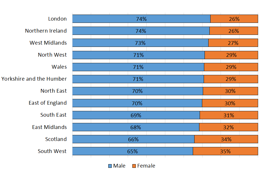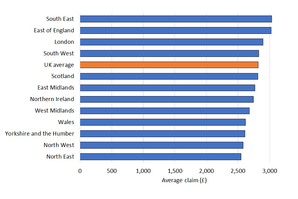 Since the average claim amount is higher for males than females as well, men account for an even higher proportion of total claim values. In the West Midlands, (79%) and London (80%) of total claim values are from men. The lowest male share is in Scotland and the South West where 72% of the total amount claimed is claimed by men.