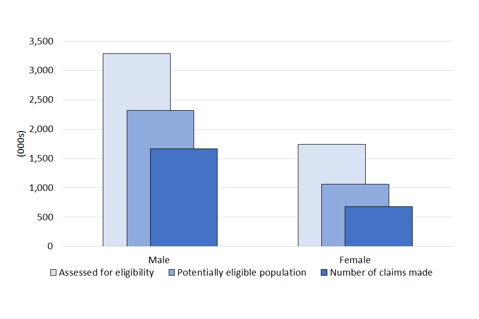Of 5.0 million individuals who were assessed for potential eligibility, men make up around two-thirds (65%), and also make up a slightly higher proportion (68%) of the potentially eligible population.