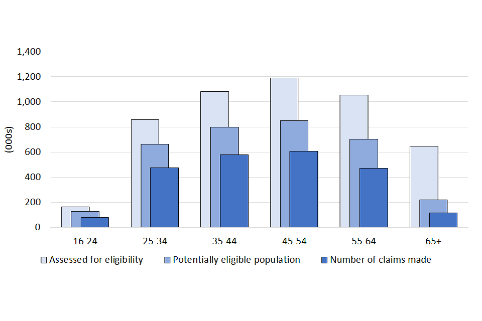 Around 89% of individuals who were assessed for potential eligibility were between the ages of 25 and 64, with over 91% of claimants coming from this age group. Take-up of the grant in these age-groups is at or above 71%, with the exception that those between 55 to 64 have a take up rate of 67%. No one age group dominates and claims are evenly spread.