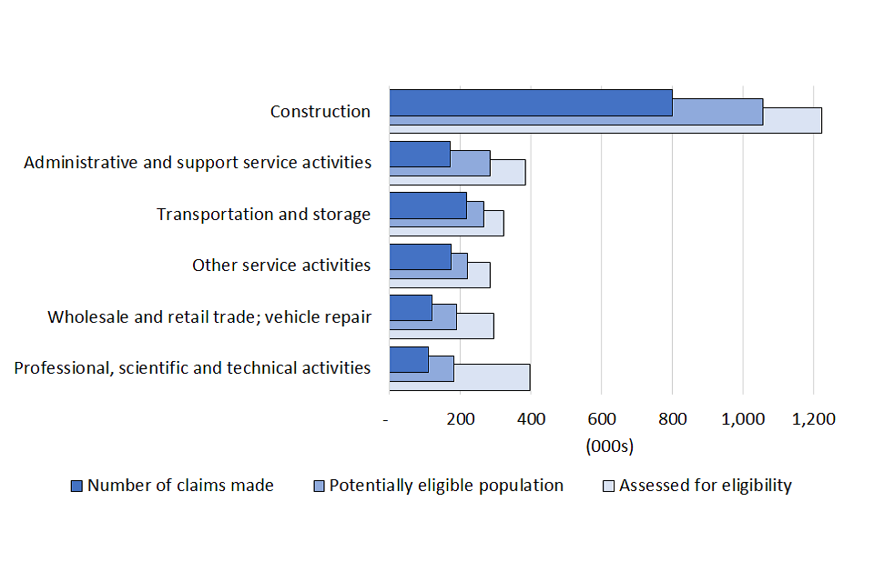 The construction industry has the largest population of individuals who were assessed for potential eligibility with over 1.2 million and just under 1.1 million of these were potentially eligible to apply. By 31 October construction workers had made 800,000 claims for SEISS totalling £2.4 billion; an average of £3,100 per claimant.