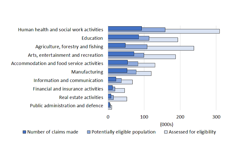 Self-employed individuals in the transportation and storage sector make up 8% of the potentially eligible population and made 217,000 claims totalling £410 million. Administrative and support services also make up 8% of the potentially eligible population and have made 171,000 claims totalling £304 million.