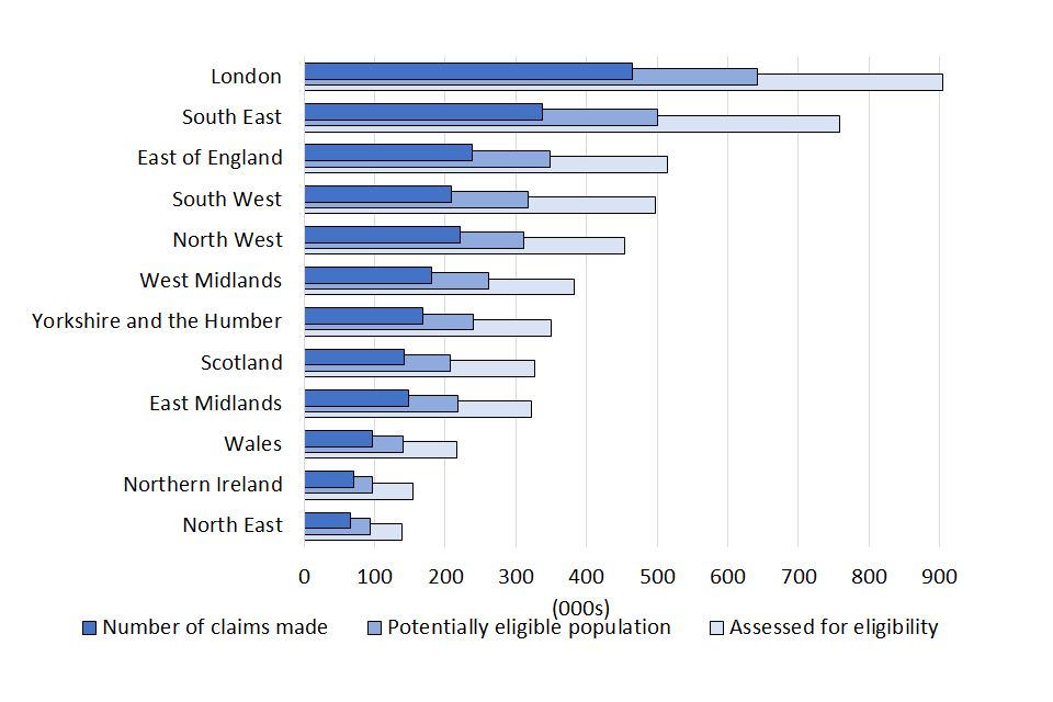 The age distribution of the potentially eligible population and claims received by 31 October is reasonably consistent across all countries and regions with the exception of London.