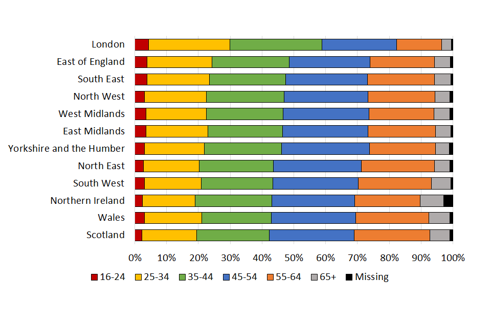 Between 41% (Wales, Scotland and Northen Ireland) and 48% (England) of the potentially eligible population in each country and region is aged under 45 except in London where 58% are under 45.