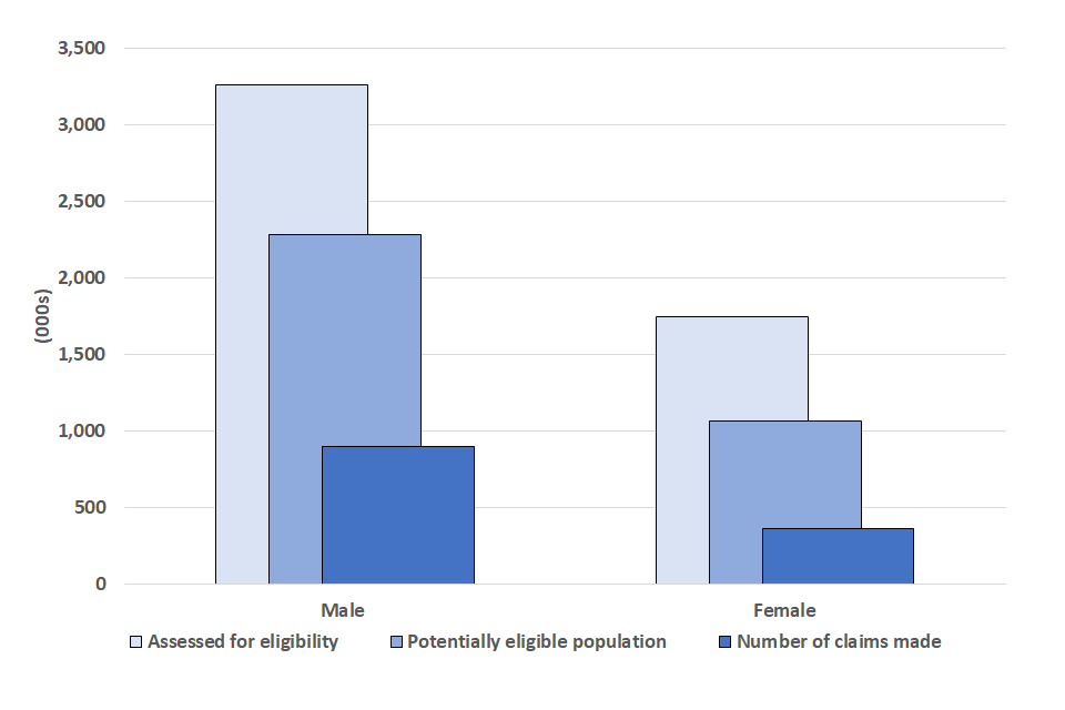 Of 5.0 million individuals who were assessed for SEISS, male claimants make up around two-thirds (65%) and make up a slightly lower proportion (68%) of the potentially eligible population.