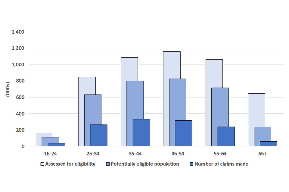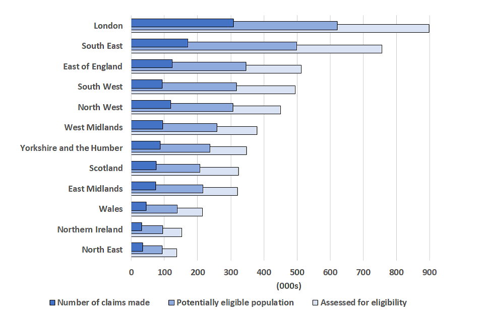 | Status | Total potentially eligible population (000s) | Total no. of claims made (000s) | Total value of claims made (£m) | Average value of claims (£) |