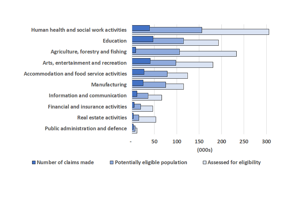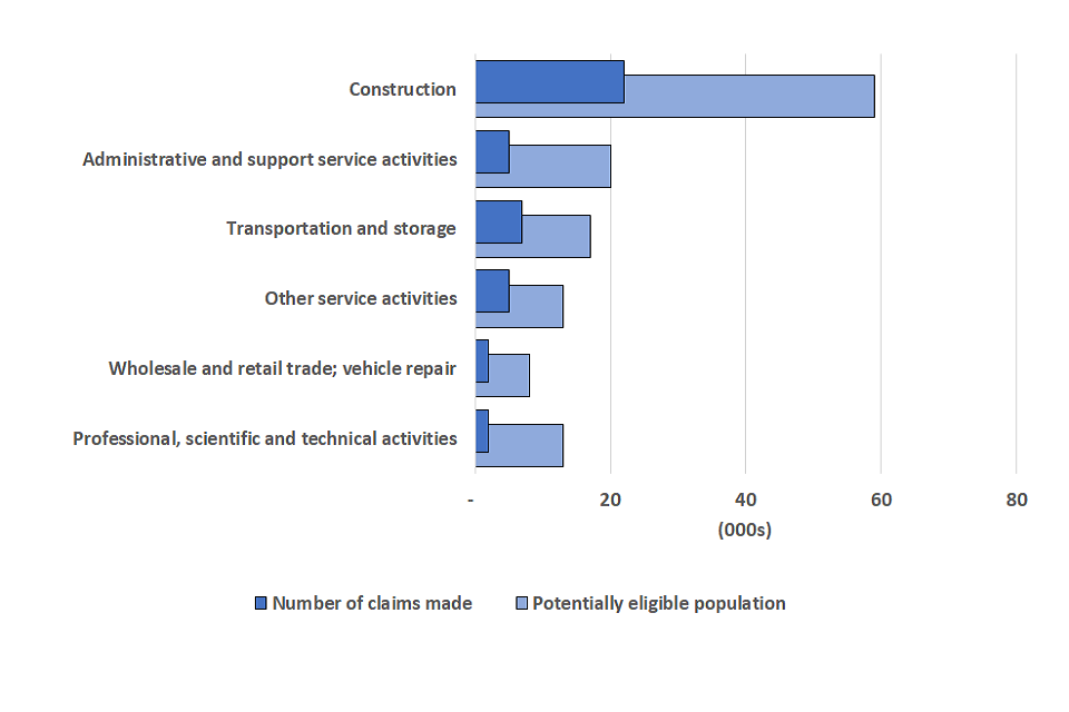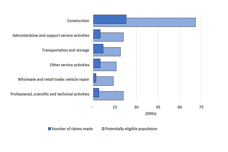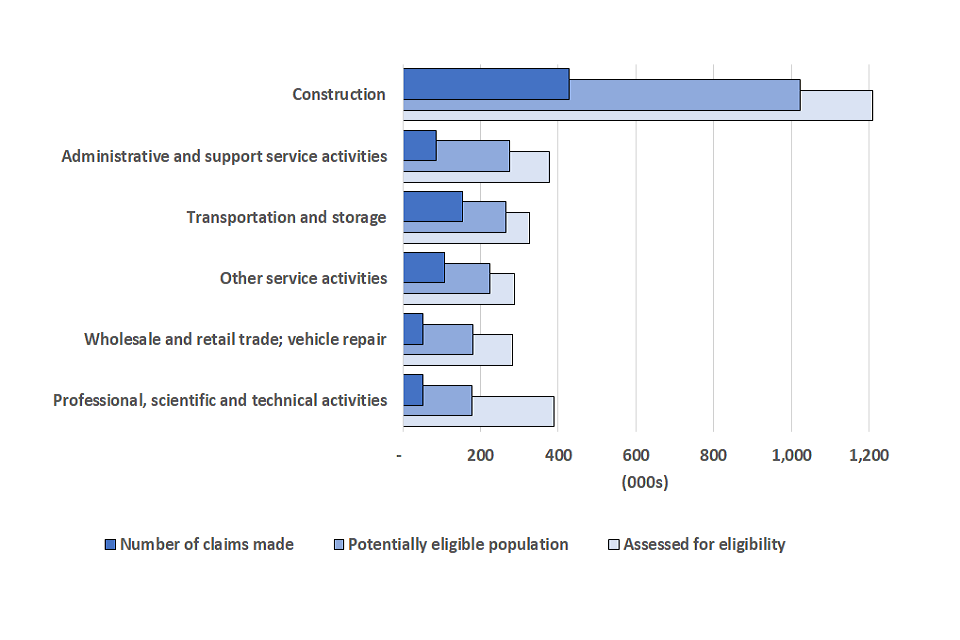 - The sector with the highest number of potentially eligible individuals and the highest proportion of claims was the construction industry. By 7 October, construction workers had made 427,000 claims for the fifth grant, totalling £1.1 billion. Construction is the largest sector among the self-employed population with 1.2 million individuals assessed for eligibility