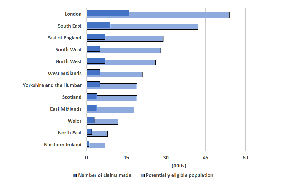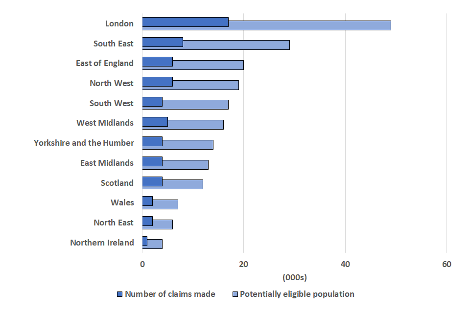 - The two regions with the highest number of fifth grant claims were London (309,000) and the South East (171,000), reflecting their relative population sizes. London had the highest take up rate at 50%