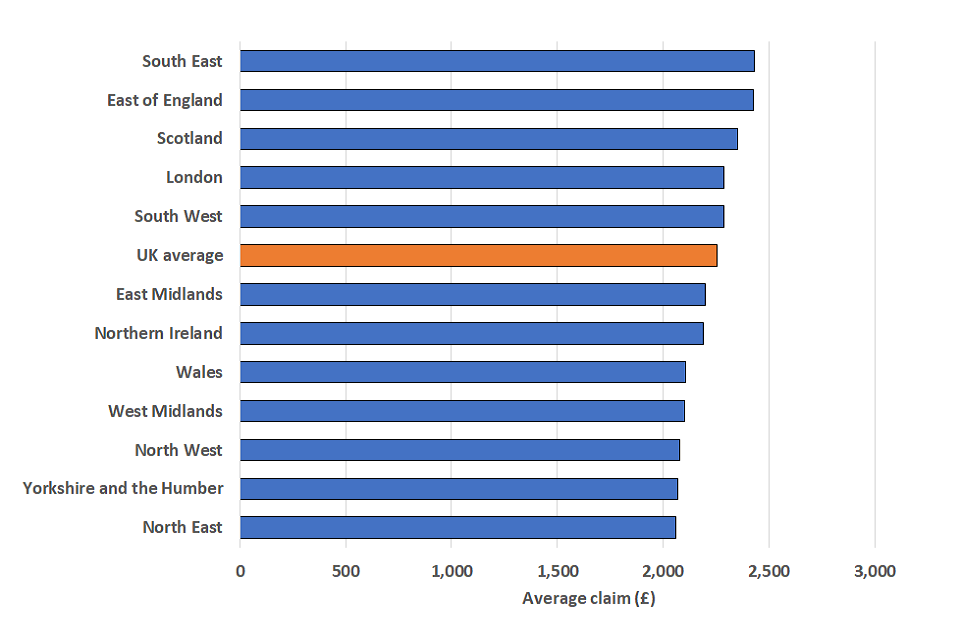A similar distribution is observed for claims and claim value with the lowest proportion aged under 45 being in Scotland (43% of claims and 42% of claim value) and the highest being in London (58% of claims and 57% of claim value).