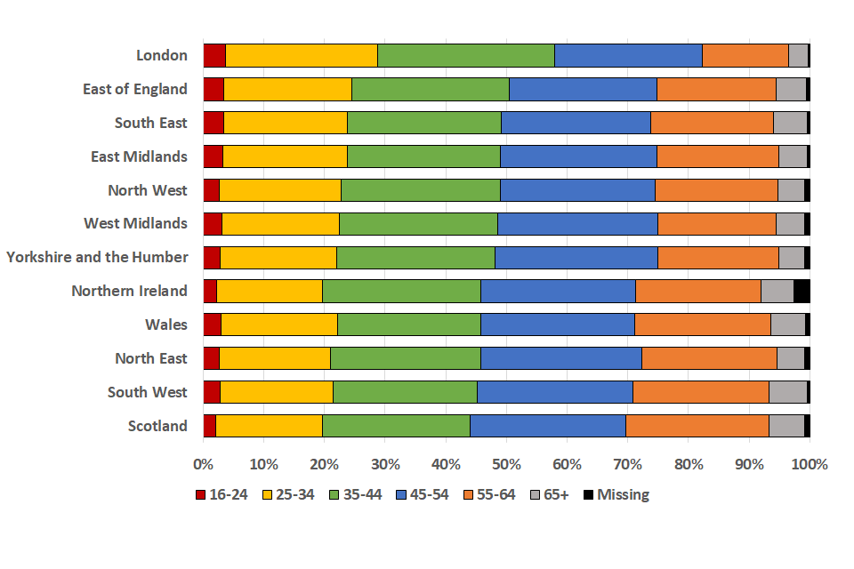 Between 41% (Scotland, Wales, South West and Northern Ireland) and 46% (the East of England) of the potentially eligible population in each country and region is aged under 45 except in London where 56% are under 45.