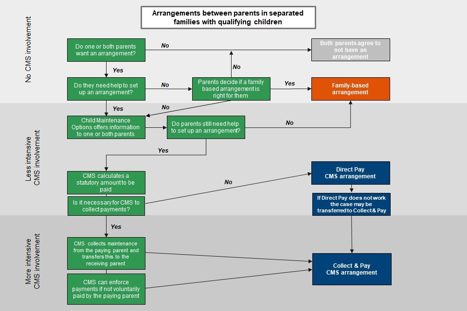 It should be noted that there is no requirement for separated families to have a child maintenance arrangement and some families may not want an arrangement. If parents do want an arrangement, they may be able to agree this themselves without the involvement of the Child Maintenance Service (CMS). Arrangements made in this way are called non-statutory arrangements or ‘family based arrangements’. Where parents want an arrangement but need help with this, support is available through the Child Maintenance Options service (from 1 April 2022 this service will be known as ‘Get Help Arranging Child Maintenance’).