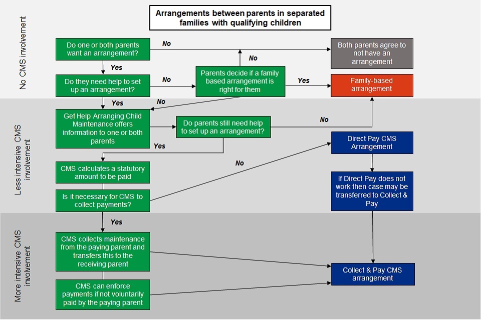 It should be noted that there is no requirement for separated families to have a child maintenance arrangement and some families may not want an arrangement. If parents do want an arrangement, they may be able to agree this themselves without the involvement of the Child Maintenance Service (CMS). Arrangements made in this way are called non-statutory arrangements or ‘family-based arrangements’. Where parents want an arrangement but need help with this, support is available through the digital service ‘Get Help Arranging Child Maintenance’.
