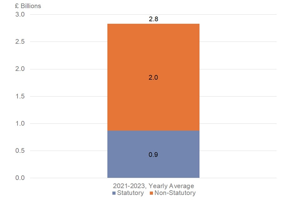On average, it is estimated that £2.8 billion in child maintenance payments was received each year by parents with care in separated families in the financial years ending 2021 to 2023. Around 69% of these payments related to non-statutory child maintenance arrangements, with around 31% relating to statutory arrangements.