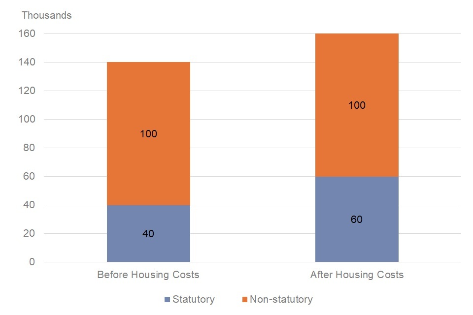 Of the 140,000 children kept out of absolute low income on a before housing costs basis, around 40,000 were in households with a statutory arrangement and 100,000 in households with a non-statutory arrangement. Of the 160,000 children kept out of absolute low income on an after housing costs basis, around 60,000 were in households with a statutory arrangement and 100,000 in households with a non-statutory basis.