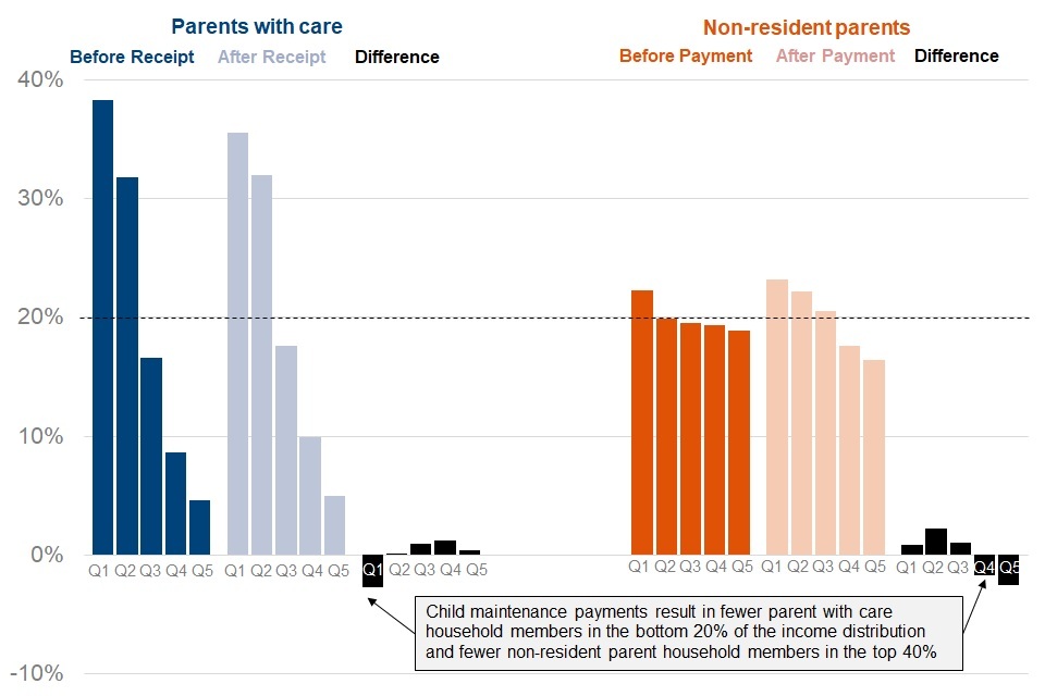 - child maintenance receipts reduced the percentage of individuals in parent with care households who are in the lowest 20% of the after housing costs income distribution by three percentage points