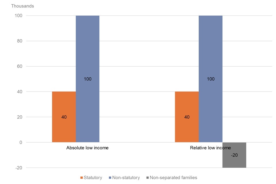 Of the 140,000 children kept out of absolute low income on an after housing costs basis, around 40,000 were in households with a statutory arrangement and 100,000 in households with a non-statutory arrangement. Of the 120,000 children kept out of relative low income on an after housing costs basis, around 40,000 were in households with a statutory arrangement and 100,000 in households with a non-statutory arrangement. 20,000 children in non-separated families were moved into relative low income due to the redistributive effects of child maintenance across the wider income distribution, although they neither pay nor receive child maintenance.