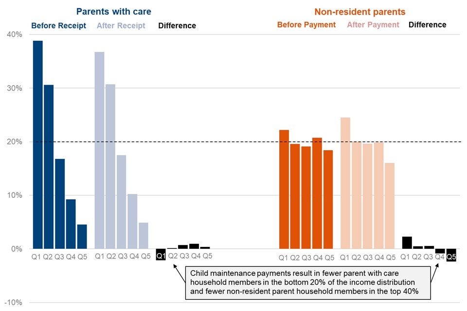 child maintenance receipts reduced the percentage of individuals in parent with care households who are in the lowest 20% of the after housing costs income distribution by two percentage points