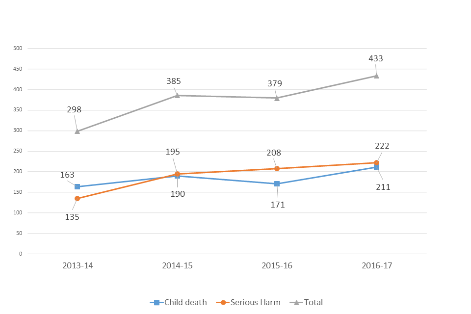 Between 1 April 2016 and 31 March 2017, 211 cases of child deaths were notified, compared with 171 in the previous year. This was a 23% increase from the previous year but there is no long-term trend.