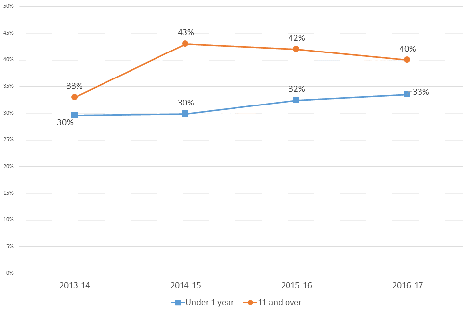 Of the 211 reported child deaths, 23 (11%) were of children who were subject to a child protection plan, a decrease from 29 (17%) in 2015 to 2016. One in five (43) reported deaths were for children looked after. The majority of these children (29 out of 43) were reported to have died from natural causes. This reflects the fact that many children become looked after because they have complex life limiting disabilities and a local authority takes on some legal responsibility for the care and wellbeing of the child. The remaining 14 child deaths of children looked after were due to accidents (2), non-accidental injury by an unrelated person (3), neglect (one), suicide (3), and for 5 of them the reason was unknown or unascertained. The proportion of deaths of children looked after is similar to last year’s picture, and an improvement on 2013 to 2014, when 1 in 4 child deaths affected children looked after.