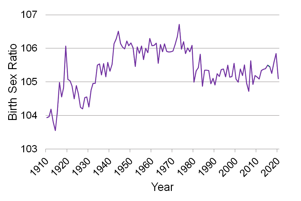 Within large populations, we can expect the birth sex ratio to vary, due to external factors including wars and economic crises. [footnote 4] Figure 1 shows the fluctuation within the UK since 1910. The chart shows that the birth sex ratio has never been above 107 over that period. The minimum ratio was 103.5 in 1914 and the maximum ratio was 106.7 in 1973. The male to female birth sex ratio has been consistently around 105 since 1980.