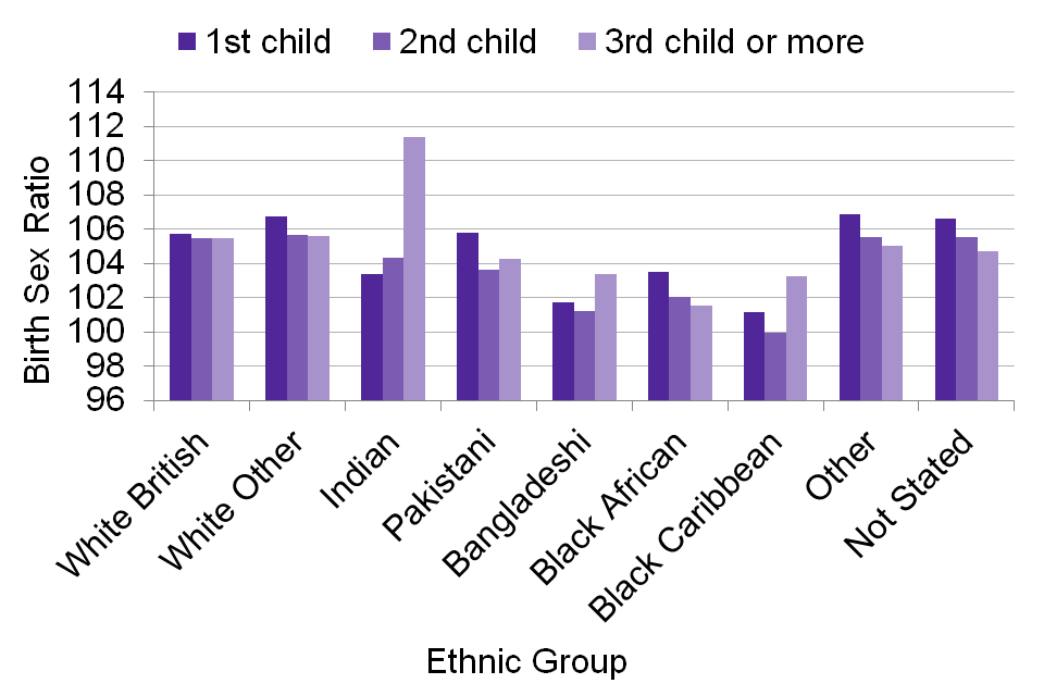 An analysis of birth sex ratios by the ethnicity of the child for England and Wales both for overall birth sex ratio and by birth order, showed no ratio to be significantly higher than 107 (see Table 3 in the accompanying statistical data spreadsheet).