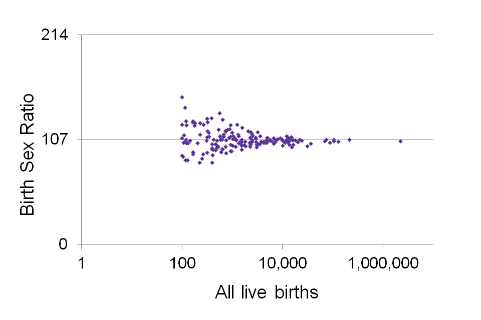 Birth sex ratios above the 107 threshold do occur, but could be due to chance, rather than due to a real difference. Statistical significance testing is carried out to determine whether any differences observed between the birth sex ratios and the 107 threshold are likely to be ‘real’ or whether they are consistent with chance fluctuations.