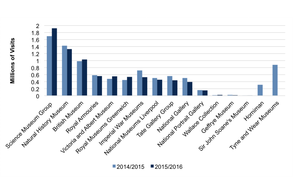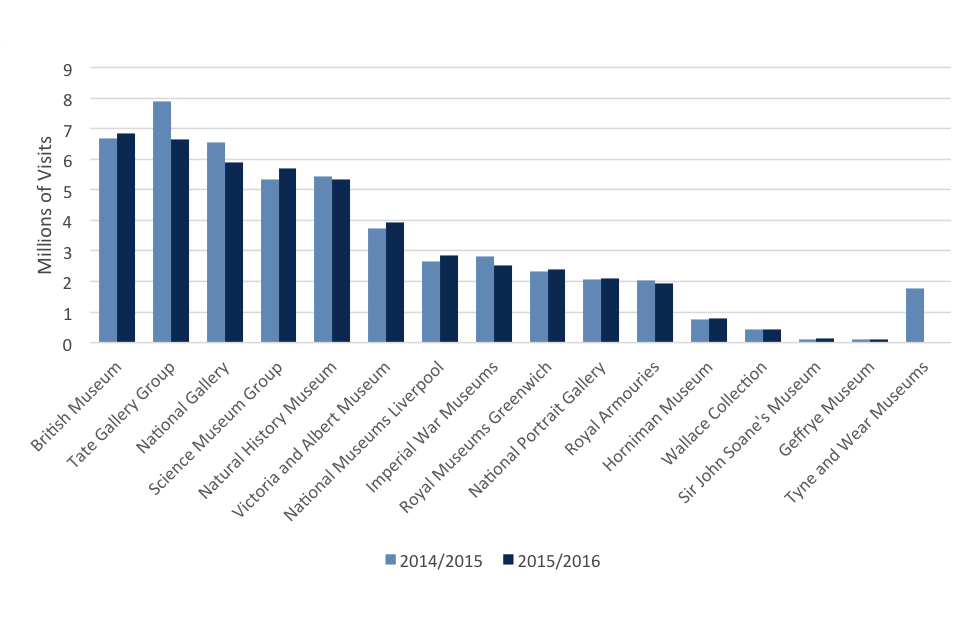 - In 2015/16 there were 47.7 million visits to DCMS-sponsored museums. This was a decline of 6.0 per cent on 2014/15, and a decline of 2.6 per cent when Tyne and Wear Museums are excluded from 2014/15.