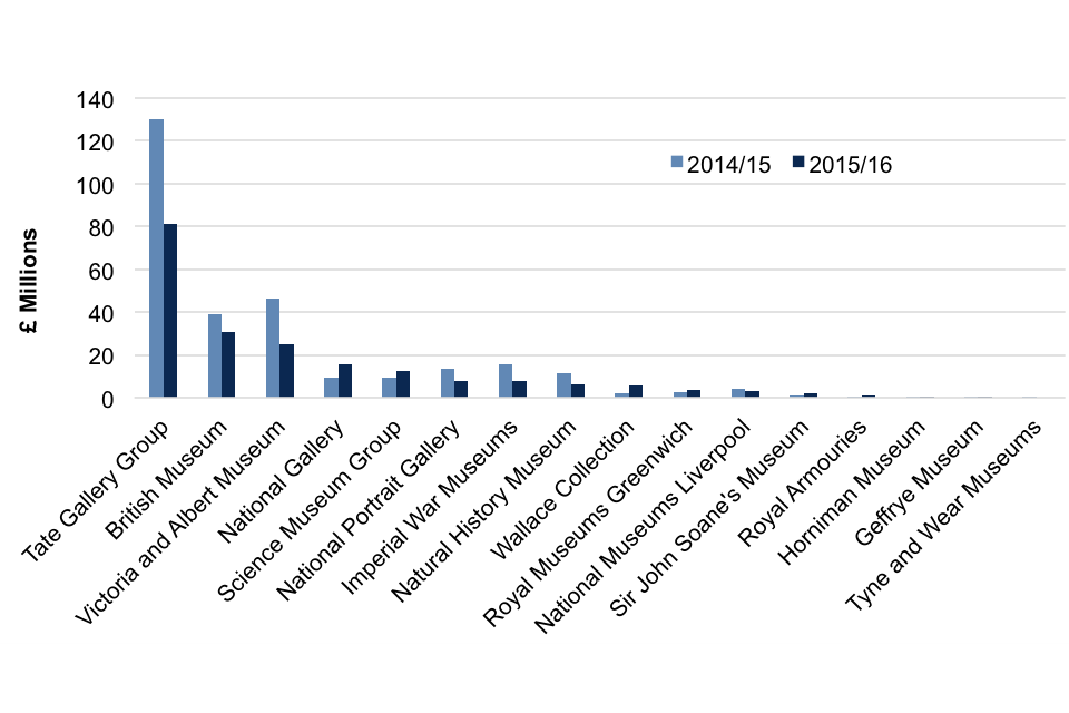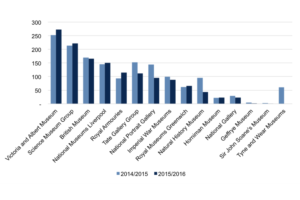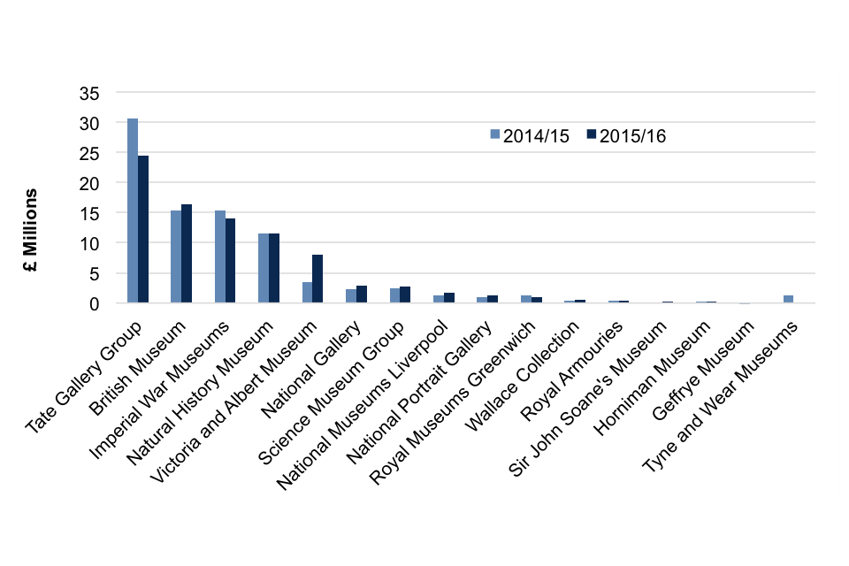 In 2014/15, DCMS also sponsored the Tyne and Wear Museums, however they were no longer sponsored in 2015/16. As a result of this, comparisons have been made both including and excluding the Tyne and Wear Museums. ↩ ↩2