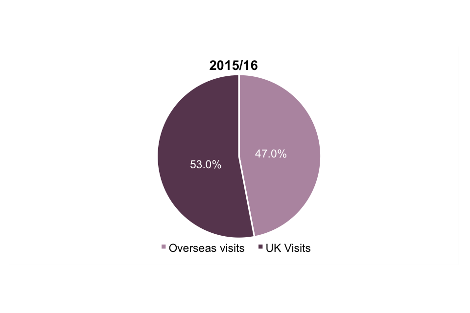 There were an estimated 22.4 million visits to sponsored museums in 2015/16 by overseas visitors, accounting for 47.0 per cent of all visits (Figure 3). This was consistent with 2014/15. When excluding Tyne and Wear Museums and the Horniman Museum from 2014/15, overseas visitors accounted for 49.2 per cent of all visits.
