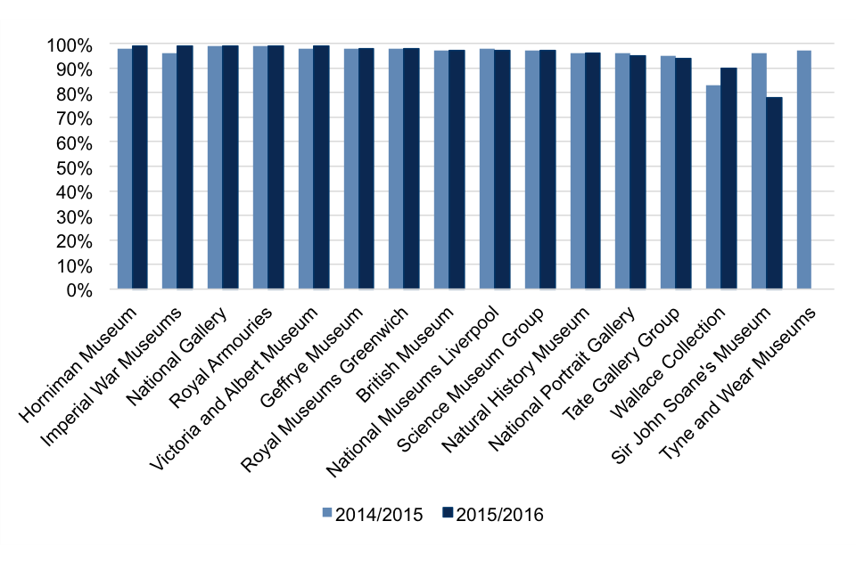 In 2015/16, across DCMS-sponsored museums and galleries, the average percentage of adults who would recommend a visit was 95.7 per cent. This is a similar proportion to 2014/15, when the figure was 96.3 per cent (Figure 9). This average was the same when the Tyne and Wear museums were removed from 2014/15.