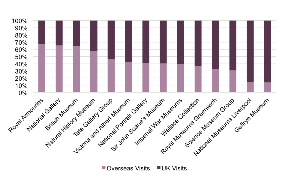 The Royal Armouries museum had the largest proportion of overseas visitors in 2015/16, with 67.5 per cent of visitors from overseas (Figure 4). This was a similar proportion to 2014/15, when the Royal Armouries also had the highest proportion of overseas visits.
