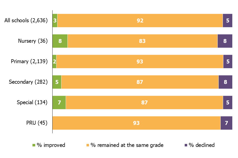 For schools judged good at their previous inspection, 3% improved to outstanding, 92% remained good and 5% declined to requires improvement or inadequate.