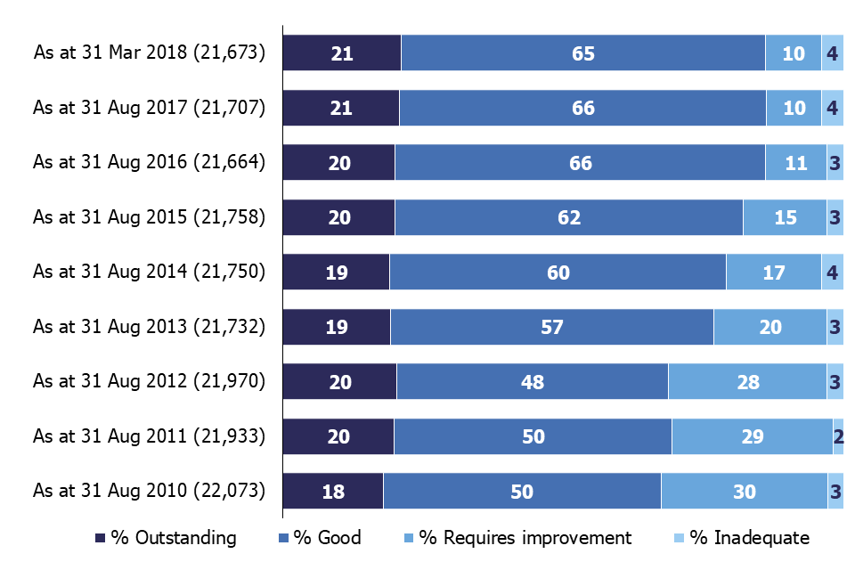 Revised data show that the proportion of outstanding schools has increased from 18% at 31 August 2010 to 21% per cent at 31 March 2018. The proportion of good schools also increased; from 50% to 65%.