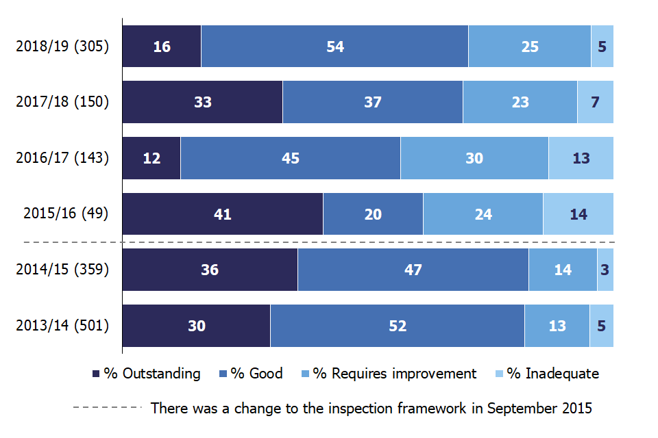 Care should be taken when comparing outcomes over time. Factors which may affect the comparability include: changes in inspection frameworks, policy, legislation, the way schools are selected for inspection, and the exemption for outstanding schools. Please see our latest methodology and quality report for more details.