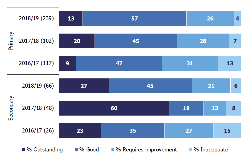 At the end of March 2019, we had judged 85% of all 21,700 schools to be good or outstanding at their most recent inspection, compared to 86% in August 2018 and 87% in August 2017.