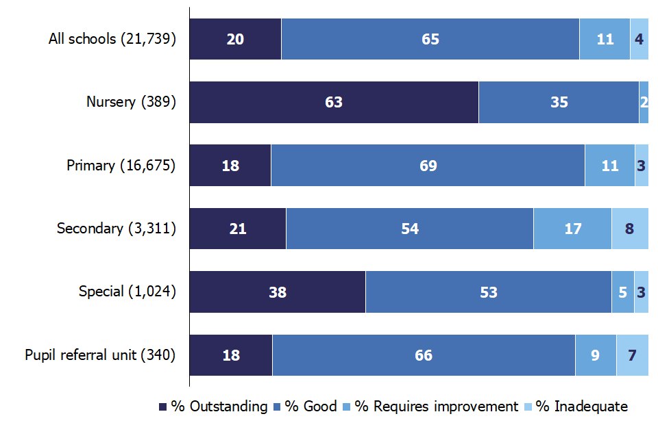 20% of state-funded schools were judged outstanding at their most recent inspection, 65% good, 11% requires improvement and 4% inadequate.