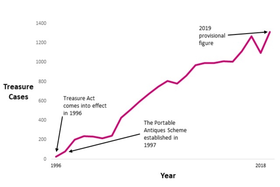 - The provisional figure for reported treasure finds in 2019 is 1,311, the highest figure on record. This makes 2019 the sixth year in a row when reported treasure finds exceeded 1,000.