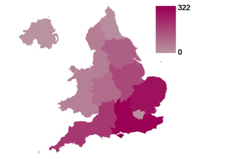 Among Government regions in England, the South East of England had the highest number of reported finds at 322, followed by the East of England with 285 finds. London had the fewest reported finds with 15. The second lowest region was the North East with 17.