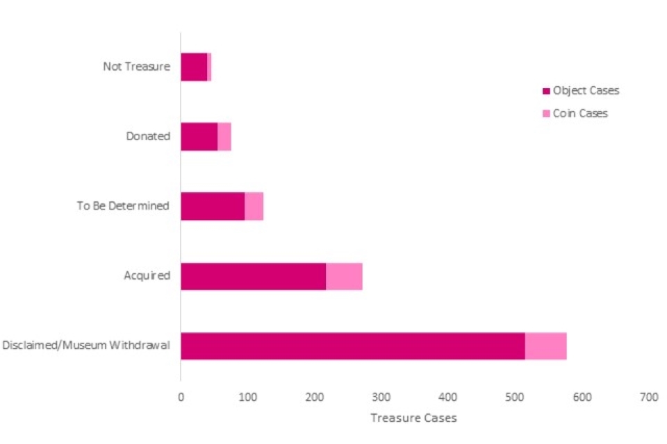 - Of reported treasure finds 921 cases (84%) were object cases[footnote 1] and 173 finds (16%) were coin cases.