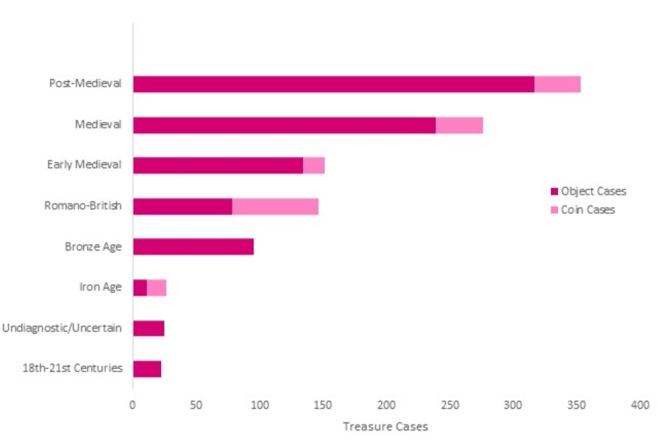 We are able to provide characteristics of the treasure finds from 2018, reporting on the object type discovered, the period of history it originates from and the number of pieces of treasure museums in the UK were interested in acquiring. This data is not yet available for 2019 due to it still being provisional. The next statistical release (due to be published in Autumn 2021) will cover characteristics for 2019 treasure finds.