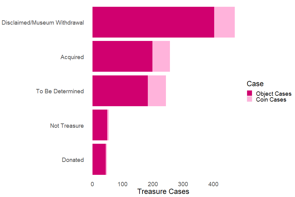 A bar chart showing the outcome of treasure finds for both object cases and coin cases. Most treasure cases are disclaimed or acquired.