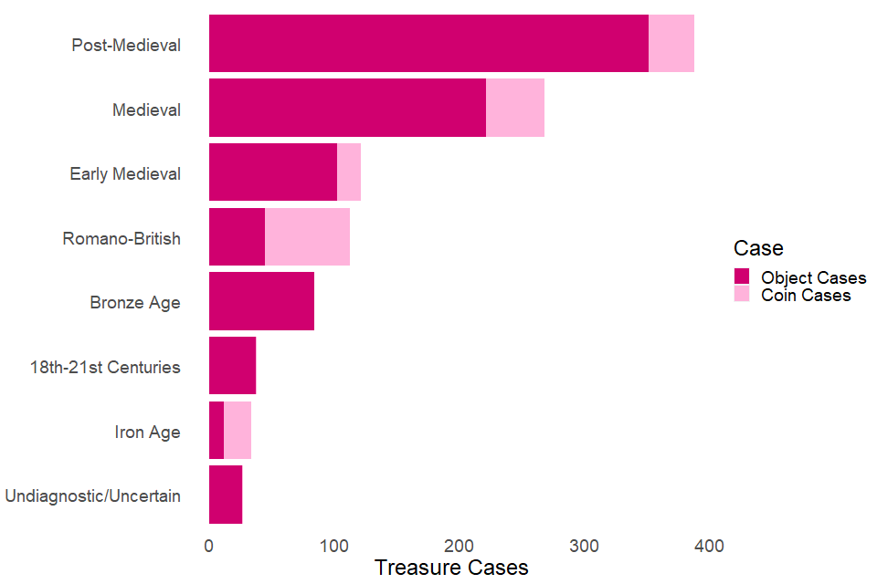 A bar chart showing the period for which treasure cases are from for both object cases and coin cases. Most finds are from the post-medieval, medieval and early medieval periods respectively.